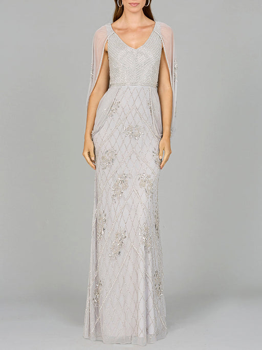 View full detailsIntricately beaded dress featuring beautiful draped cape sleeves in two beautiful and elegant colors. This dress features stunning beaded details a...