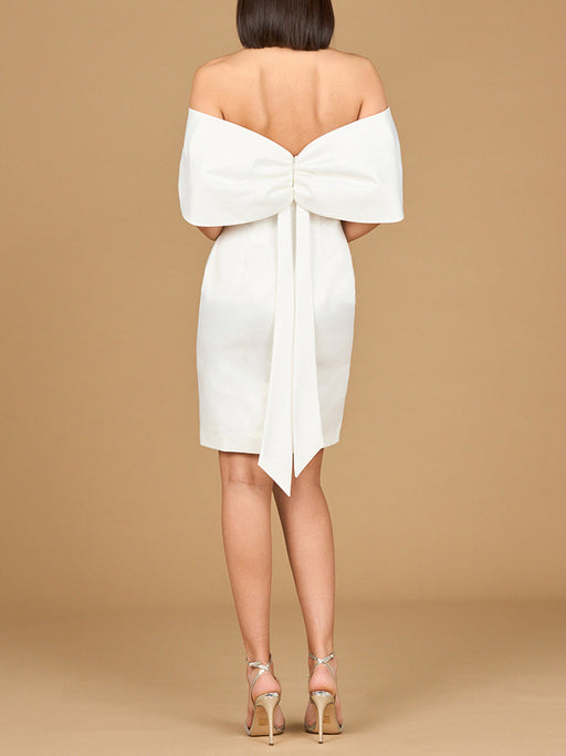 View full detailsThis bridal mini showcases an off-shoulder design with a strapless bodice and a sophisticated bow detail at the back. The skirt falls to the knee, ...