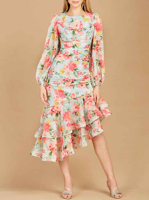 View full detailsA showstopper! Long blouson sleeve midi dress with an asymmetrical ruffled hemline in a floral pattern. Features a high neckline but is a party in ...