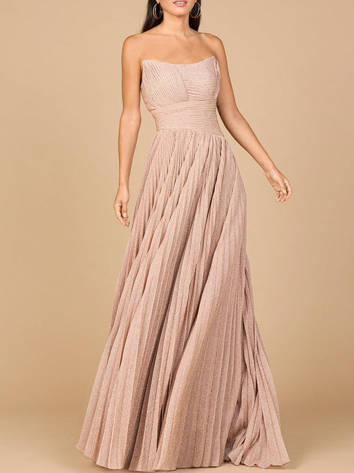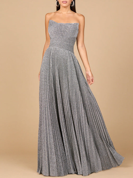 View full detailsGet ready to flaunt yourself in this flouncy strapless dress with a metallic sheen, scoop neckline and elegant ruched bodice. The pleated skirt add...