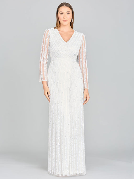 View full detailsSophisticated evening dress with tonal sequins featuring a v-neckline over a slim fitting silhouette. Product Details Back zip Polyester lace on p...