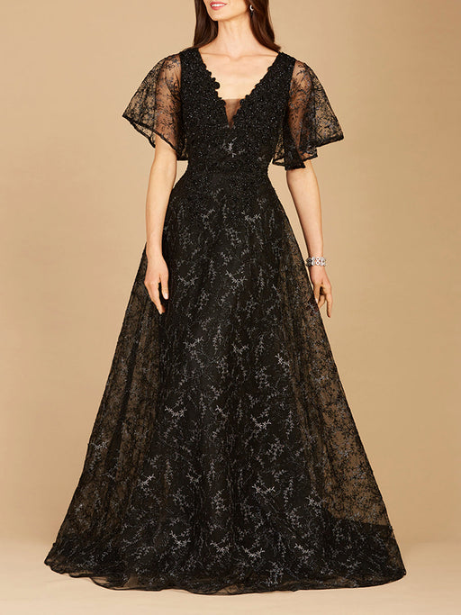 View full detailsShort V-neckline cap sleeve dress fully embellished with rhinestones and beads in a floral and geometric pattern. Stretch tulle fabric on polyester...