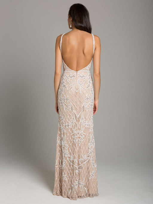 View full detailsTulle fabric Nude color long dress embellished with beads and pearls. This sleeveless dress has beautiful plunging V neckline and back. Product Det...