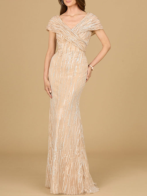 View full detailsThis lovely gown featuring a v-neckline with overlapping cap sleeves that can be worn off shoulder. This dress is finished off with a mermaid botto...