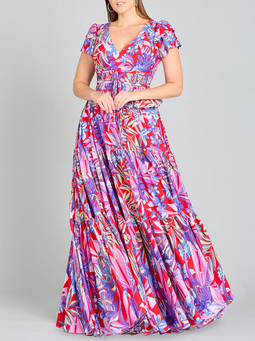 View full detailsWOW! This is an A-line print gown with v-neck straps in a floral pattern with cap sleeves. The flutter details at the waist with bows are for addit...