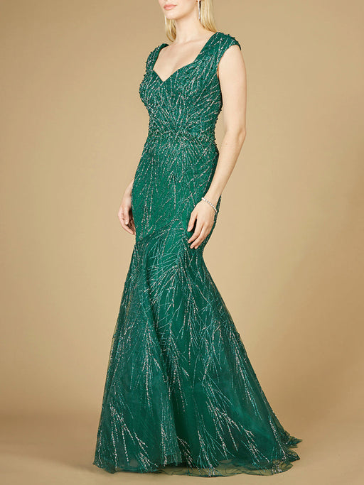 View full detailsMermaid lace gown featuring a v-neckline and mini cap sleeves. A unique style with intricate lace details as well as beads. Ideal for any fancy p...
