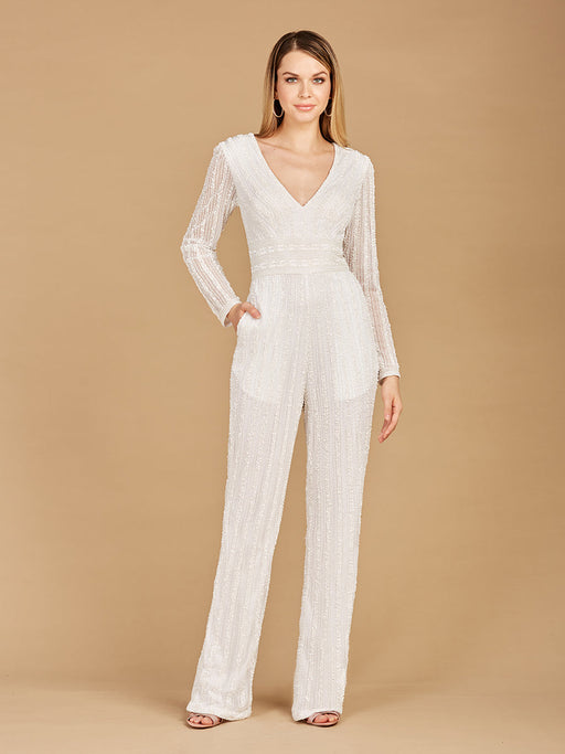 View full detailsStunning Long sleeve jumpsuit featuring intricate beading throughout. This gorgeous dress is perfect for any bride for a rehearsal dinner, bachel...