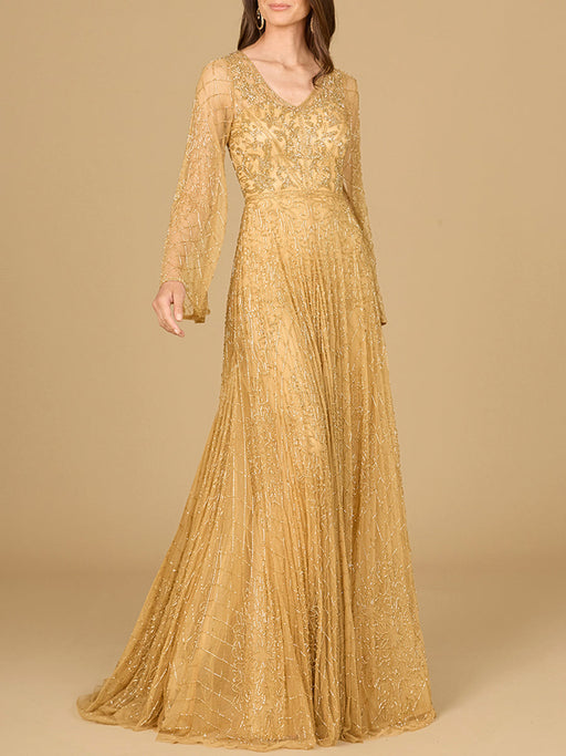 View full detailsThis gown with a flowy, pleated skirt features long sleeves, v neckline and has embellishments in an art deco and lined pattern. This exquisite dre...