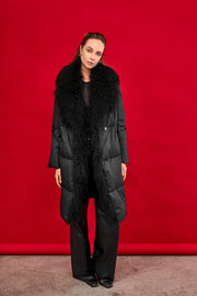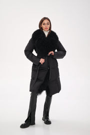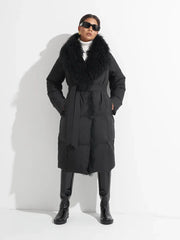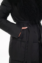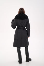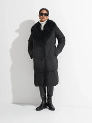 Luxurious white goose down insulated, elevated with quilt design, this coat is framed with a genuine Lama fur trim, delivering a sophisticated winter look with a feminine silhouette and luxury details.