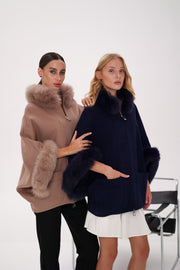 Genuine Polar Fox Fur Cashmere Blend Poncho in True Navy