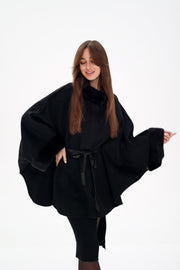Crowned with a genuine Scandinavian fur trim collar, this pure wool poncho coat exudes sophistication and is accented by luxe leather belt. Premium quality 100% virgin wool, once reserved for royalty, makes this coat solid addition to your wardrobe. And the Scandinavian Mink fur trim adds stunning contrast of texture and tone. Finished with a flattering, free-fitting cut, this premium coat is the one you’ll treasure.