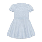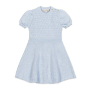The sweetest sweater dress for fall is here, in a soft organic cotton style that she'll be wanting to wear time and time again. Features feminine puff sleeves with ruffle edges, a mock neck with gold button details, and a flared skirt that was made for twirling. A delicate stitch on the bodice is the finishing touch.