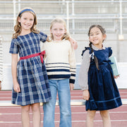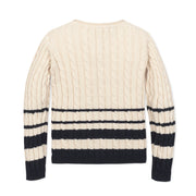 Your girl will be back to school style personified in our beautiful cable knit sweater crafted from soft organic cotton. Features a delicate allover cable knit paired with stripe details at the cuffs and hem. Gold buttons at the shoulder add a bit of shine. Pairs perfectly with our collection of organic cotton tops, skirts, and leggings.