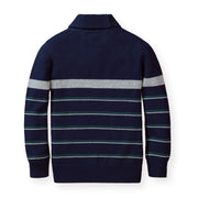 Our shawl collar sweater in soft organic cotton is the ultimate in comfort and style for your guy. Special attention to details such as the shawl collar with button closure and a super cool stripe make this an instant classic that can be worn on repeat and handed down time and again.