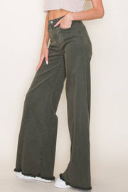 Experience the vintage appeal of the O2 Front Seam Wide Leg Denim Jeans in a army olive. The high waist, flare cut, and raw hem add unique detailing to these super soft and stretchy jeans. Perfect for a comfortable and stylish look!