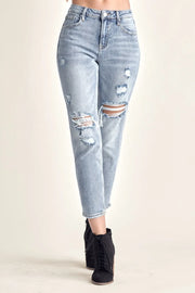 These Distressed Slim Cropped Jeans are a perfect blend of edgy and chic. The slim fit design hugs your curves in all the right places, creating a flattering silhouette. The distressed detailing adds a worn-in and rebellious touch to these jeans, giving them a cool and trendy vibe. The cropped length adds a modern and stylish twist, making them versatile for various outfit combinations. Made from high-quality denim, they offer both comfort and durability. These jeans can be easily dressed up with heels or dressed down with sneakers for any occasion. Whether you're going for a casual day look or a night out with friends, these distressed slim cropped jeans will effortlessly elevate your style.