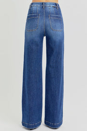Elevate your style with our Risen High Rise Wide Leg Slanted Pocket Jeans in dark wash.