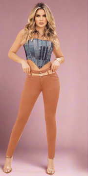 π Our SAFARI jeans offer a bold and flattering look, designed to enhance your shape with a distinctive silhouette. These terracotta/rust orange skinny jeans feature a comfortable high waist (Tiro Alto) with a distinctive three-button closure (Pretina Tiro Alto 3 Botones), and built-in tummy control for a confident figure. They come with a stylish matching belt and boast a seamless, no-pocket design (Jean Sin Bolsillo) for an exceptionally streamlined profile. Crafted with a "Piel de Durazno" (Peach Skin) effect fabric (Tela Efecto Piel de Durazno), these jeans provide incredible softness and comfortable stretch.