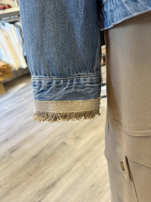 Jean jacket with starfish patch on the back. The touch of fringe adds the cutest detail!