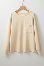 This top boasts a solid color and versatile style. With corded detailing, it has a textured and unique look. Long sleeves offer extra coverage and warmth, while the drop shoulder design adds to its relaxed and trendy aesthetic.