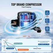 Engineered for efficiency, the freezer comes with multiple freezing modes—including hard chill, shock freeze, and soft freeze—to suit a variety of foods. Its powerful compressor circulates cold air for consistent, rapid chilling while intelligent features like precise temperature control, automatic defrosting, and overload protection make operation simple and hassle-free. The thick insulated door with an automatic closing design ensures minimal cold air loss, reducing energy consumption while keeping your products perfectly preserved.