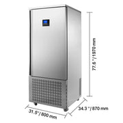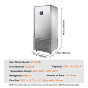 • This 370L commercial blast freezer quickly chills food, dropping temperatures from 194℉ to 37.4℉ in 90 minutes and reaching -0.4℉ in 240 minutes. With 15 trays and ample space, it’s ideal for seafood, gelato, and busy kitchens needing fast, reliable freezing.