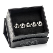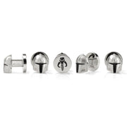 Since members of the Mandalorian guild never take off their helmets, we figured they deserved a tribute. This set of 3D studs feature Mando's helmet set in shiny silver. Black detailing adds dimension to the aesthetic of the cufflink. The fixed backing features a debossed mythosaur skull on the reverse side. Experience the Way of the Mandalore with our expertly crafted Stainless Steel studs. They are built to withstand the challenges of bounty hunting across the galaxy, infused with the honor of Mandalorian creed, and ready to accompany you on interstellar hunts. Pairs perfectly with our 3D Mandalorian Cufflinks. Officially licensed by LucasFilm LTD.