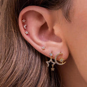 This earring set features stacked lobe designs that capture the magic of the universe with star and moon motifs. The star studs and drop add a twinkling charm, while the hoops with teardrop, moon, and star chain drops bring a celestial elegance. Mix and match these pieces to create your own cosmic style—perfect for any occasion, from everyday wear to special events.