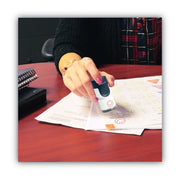 Attached flip-open lid keeps surfaces clean and prolongs stamp life. Re-inkable for thousands of impressions. Ergonomic rubber grip.