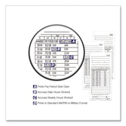 The ATR480 Time Clock automatically calculates and totals employee time for businesses with up to 50 employees. With this time clock, you can set overtime policies, implement rounding rules, and deduct break time to accommodate your payroll needs. The ATR480 supports job costing and can be set to automatically adjust for Daylight Saving Time. This top-loading clock features automatic card positioning and easy-to-read imprints in standard (AM/PM) or military (24 Hour) time. Employee time can be set to record in minutes or hundredths. A two-color printing option makes it easy to spot early and late punches. Use the built-in programmable buzzer or connect to an external signal device to notify employees about shift start and stop times. To enhance security, clock programming can be password protected and the clock case is secured with lock and key to prevent tampering. The built-in battery allows employees to keep punching, even during power outages. Bundle includes three two-color ribbons (one installed, two extra), 300 time cards, two 10-pocket time card racks, four keys, owners manual and power cord.
