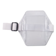 Heavy duty arm badge holder provides protection and easy access for your ID badge. Great for the active industrial worker who works around machinery and cannot take the chance of getting hung up on something. Clear, vinyl pouch. White, adjustable elastic band will fit most adult men's arms.