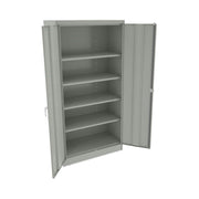 Assembled storage cabinet with three-point locking bar system locks top, bottom, and doors. Durable, reinforced doors with satin chrome double handles open 180° for easy access to contents. Industrial-grade steel with powder coat finish for long lasting use. The sturdy, 16-gauge door frame prevents racking. Heavy duty secure knuckle hinges for longevity. Built-in leveling glides help compensate for uneven floors.