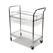 Ideal mobile carry-all cart. Use to haul mail, packages, boxes, books or files around the office. Top basket can accommodate letter- or legal-size files with included adjustable file rods. 7" deep top basket. Sturdy bottom basket with 4" raised sides to prevent larger items from sliding off during transport. Heavy-duty metal tube and wire construction resists scratches and withstands constant use. Commercial grade 4" casters with two locking. Snaps together in minutes without tools. Shelf and basket height adjustable in 1" increments.