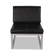 Contemporary geometric styling in soft durable bonded leather. Modular armless design allows multiple chairs to be configured to create layouts that work in any room. Configure with ottomans suitable as side tables, coffee tables, or just to kick your legs up. Heavy-duty silver steel structure withstands constant use and movement.
