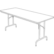 Folding table with scratch-resistant melamine top that is 0.63" thick with a one-piece, 1.75" steel apron and protective edging. Fully finished laminate on top and underside to prevent warping. Laminate is scratch, dent, and water-resistant for long-lasting use. The gravity leg-locking mechanism makes set-up quick and easy. Folds to 2.5" thick and locks for easy transport and storage. 1" diameter, steel legs have plastic foot caps to protect floors. Holds up to 1,200 lbs of evenly distributed weight.