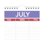 One-month view, plus a yearly calendar reference. Ruled daily blocks. Federal holidays printed in red. Wirebound with hanging loop. Full chipboard back. Printed on high-quality paper.