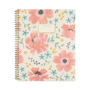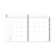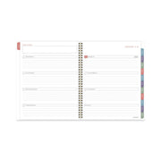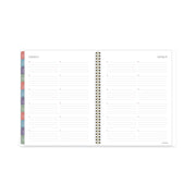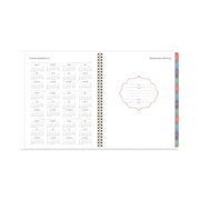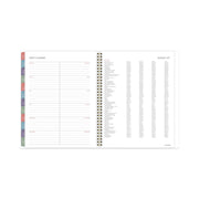 A painterly floral design on the cover features flowers in shades of pink, purple, green and gray. Planner covers 13 months from January to January with Julian dates. High-quality paper features superior ink bleed resistance. One week per two-page spread has ruled planning space for each day, plus an area to jot down weekly goals and a notes section. Tick marks let you customize and plan for multiple activities. One month per two-page spread has unruled daily blocks, notes space, and past/future month reference calendars. Each month is tabbed in rotating colors. Special pages include a holiday list, 7 contacts, 6 notes, 3-year reference calendar and event calendar. Double-sided poly pocket stores loose sheets. Interior pages feature a clean font printed in a rotating complementary palette. Durable cover has gold twin wire binding.
