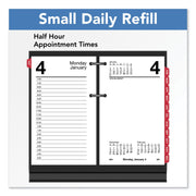 Half-hour appointment times with monthly overviews. One day per two-page spread with a unique design; Saturday/Sunday combined. Monthly tabs for easy referencing of dates; lined for projects, to-do’s and reminders. Tab set is printed in red; easy snap-in feature. Loose-leaf, two-hole punched pages for E17-style calendar bases.