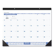 Desk pad is printed in blue and gray ink for a classic but stylish look. One month per page with unruled daily blocks and full-year calendar reference. Durable backboard provides a sturdy writing surface. Black, wide paper headband. Printed on high-quality paper with superior ink bleed resistance.