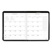 Sophisticated sewn cover and monthly format design. Premium paper resists ink bleed. Features space for prioritized activities and notes as well as storage pockets and a business card holder. One month per two-page spread with unruled blocks; past and future months reference. Note pad included. Deluxe black simulated leather cover with pen loop.