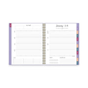 Planner features a durable, stylish poly cover with gold twin-wire binding. 13-month date range from January to January for year round planning. High-quality paper features superior ink bleed resistance. One week per two-page spread has ruled daily columns with tick marks for custom planning. Additional sections include notes, top 3 goals, to-do, track it and wins of the week. One month per two-page spread has unruled daily blocks and space to list goals, to-do's, notes and ideas. Each month is tabbed to quickly flip to any date. Special pages include a holiday listing, 3-year reference calendar, future planning pages, gift ideas, birthdays/important dates, contacts, expense tracking, and notes. Includes repositionable stickers in different colors to track multiple projects, people or events, and a double-sided interior pocket to store loose papers.