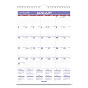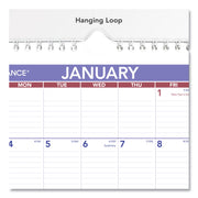 One-month view, plus a yearly calendar reference. Ruled daily blocks. Federal holidays printed in red. Wirebound with hanging loop. Full chipboard back. Printed on high-quality paper.