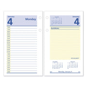 Yellow highlighted section for notes and to-do’s. One day per two-page spread ruled for appointments; full weekends. Past, current and future months reference. Monthly tabs for easy referencing of dates; easy snap-in feature. Loose-leaf pages are punched and fit two-ring, E17-style calendar bases.