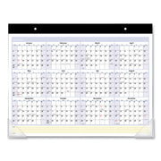 Yellow highlighted section for notes and to-do's. Durable backboard provides a sturdy writing surface. Includes bonus page with future year reference. One month per page with ruled blocks; shaded weekends. Full-year calendar reference; federal holidays highlighted. Black, wide paper headband with eyelets.
