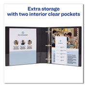 Durable binder features a sturdy construction that's ideal for frequent referencing. The DuraHinge® design is stronger, lasts longer and resists tearing, and the DuraEdge® feature makes the sides and top more pliable, providing greater split resistance. Deeply textured film offers a smoother finish and features a linen pattern for a high-quality look and feel. The binder features wider front and back panels to fully cover standard dividers and sheet protectors. Slant rings have a higher page capacity when compared to the same size round rings. Pages lie flat with back-mounted rings. Two interior pockets provide plenty of room to store both punched and unpunched paperwork.
