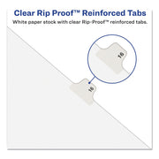 Rip Proof™ reinforced tabs printed on both sides with exhibit letter. Easy-to-read Helvetica bold type stands out. Unpunched for flexibility in binding.