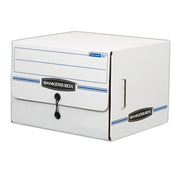 Bankers Box SIDE-TAB Storage Boxes feature a drop-front lid that provides easy access to end-tab patient files and medical records. Designed for shelf storage, these sturdy units stack two high. Center divider holds file folders upright for easy organization. String & button closure keeps files securely stored. Made from corrugated cardboard.