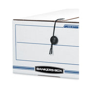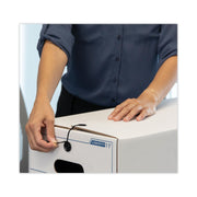 Bankers Box Medium Duty Strength Storage Boxes feature a string & button closure to keep contents secure even if box is overturned. FastFold® quick and easy assembly. Medium-duty stacking strength for use with or without shelving. Plastic handle for easy access to records. Made from corrugated paper.
