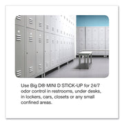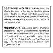 BIG D® MINI D STICK-UP is packaged in its own plastic dispenser which can be attached with a strip of double-faced tape (included). Ideal for use under desks, in lockers, cars, closets or restrooms, MINI D STICK-UP is adjustable for full control of product exposure. MINI D STICK-UP deodorants solve a multitude of problems. They will kill odors in their vicinity and continue to do so for up to three months. Also, they can't spill, so they can be used in many places where a bottle of liquid isn't practical. They are easy to handle and always leave a pleasant scent lingering in the air.