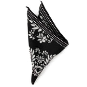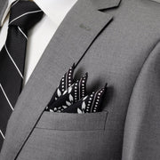A beautiful yet masculine white floral mandala design creates the pattern on this black pocket square. Our pocket square will retain its shape in whatever fold you make thanks to being crafted with durable yet soft 100% Silk. A perfect accessory that can be worn for both casual and formal events. Pairs well with our Black Silk Tie.